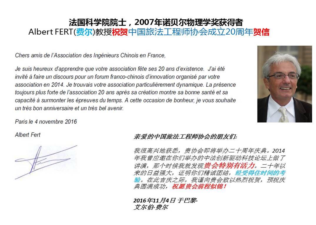本次庆典活动受到了中法两地相关学界、侨界的密切关注。法国科学院院士,2007年诺贝尔物理学奖获得者Albert Fert(费尔)教授特意发来贺信称赞中国旅法工程师协会特别有活力,祝贺生日庆典圆满成功,协会前程似锦。