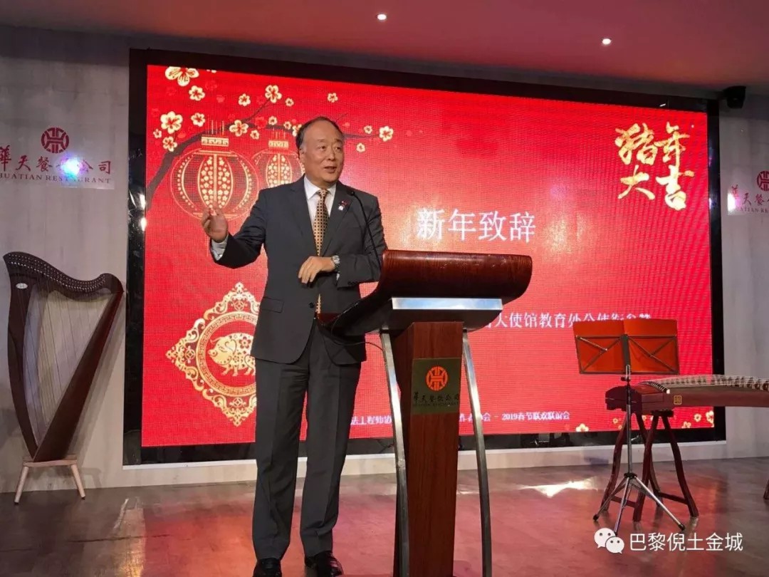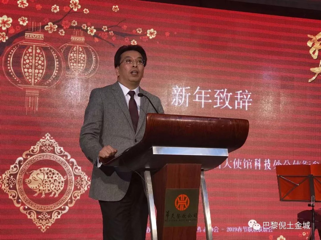 中国驻法使馆教育处杨进公参发表了热情洋溢、激昂风趣的讲话。他首先感谢中国旅法工程师协会与全法中国科技工作者协会主办这次春节联欢活动,并表示教育处永远是广大留学人员的家。他借此机会向给各在场的协会领导、专家、来宾拜年。祝大家猪年大吉,阖家幸福,身体健康,工作顺利!他为广大新老留学人员事业有成,为中法科技合作作出贡献,为新老各界留学人员团结互助,为今天欢聚一堂,载歌载舞,充满活力,展现留学人员新面貌而感到十分高兴。他指出,中法科技合作非常有成效。中国改革开放以来,从法国引进的成套的先进技术和科研方法超过超过美国,英国,加拿大和澳大利亚的总和。今天,12万法国学生在学中文。法国精英工程师教育闻名于世,中国现有十多所中法工程师学校,他希望广大留学人员支持在中国开展更深入而广泛的法国工程师教育合作。