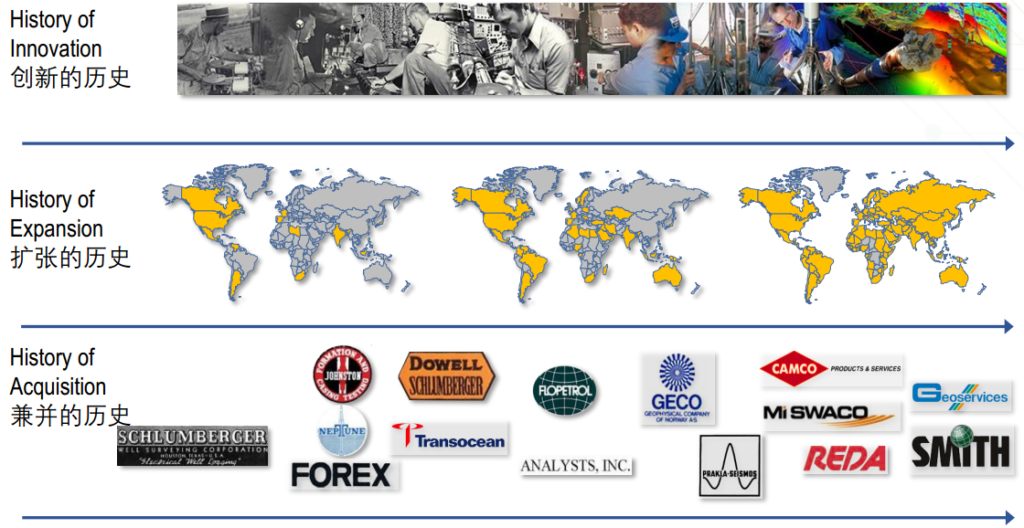 斯伦贝谢公司成立于1919年,是世界500强企业之一,也是传统油田服务公司中营业额排名首位的公司。斯伦贝谢于南北美洲起家,随后在非洲、欧洲和大洋洲建立了业务实体部门,然后进一步拓展了东亚和东欧的市场。其业务活动目前已经覆盖全球大部分国家。