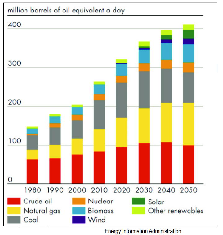 至少到2050年,我们仍将处于使用混合能源(mix energy)的阶段,也就是传统油气、煤炭等资源与新能源共同使用。这是因为,首先油气能源的基础设施已经建设得非常优良和完备,商业化程度极高,能源使用的性价比和商业效率的优势很大;同时,新能源的研发和使用要求非常大的投资力度,其在各个国家和地区的发展很不均衡。